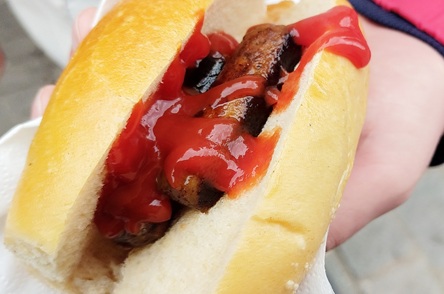 Viermal vegane Bratwürste (3 im Weckla) auf dem Hauptmarkt, zweimal in der Nähe