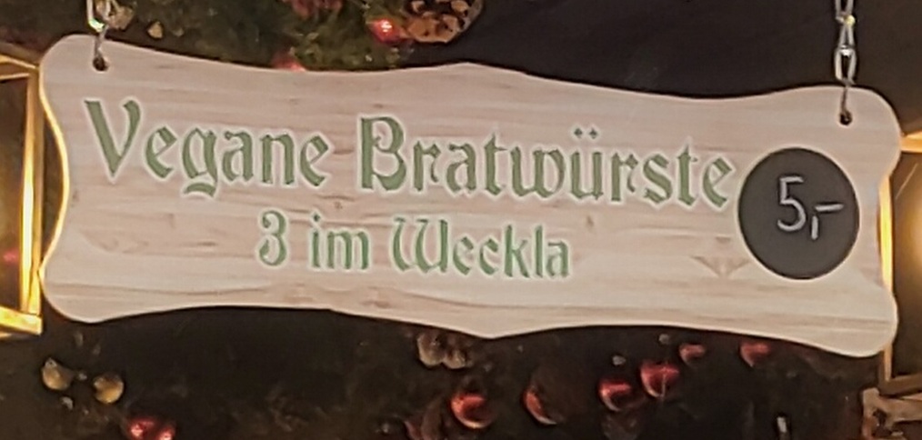 Etwas abseits vom Trubel des Weihnachtsmarktes, am Bratwurststand am Weißen Turm, bekommst du übrigens seit einigen Monaten ganzjährig vegane Bratwürste im Brötchen.
