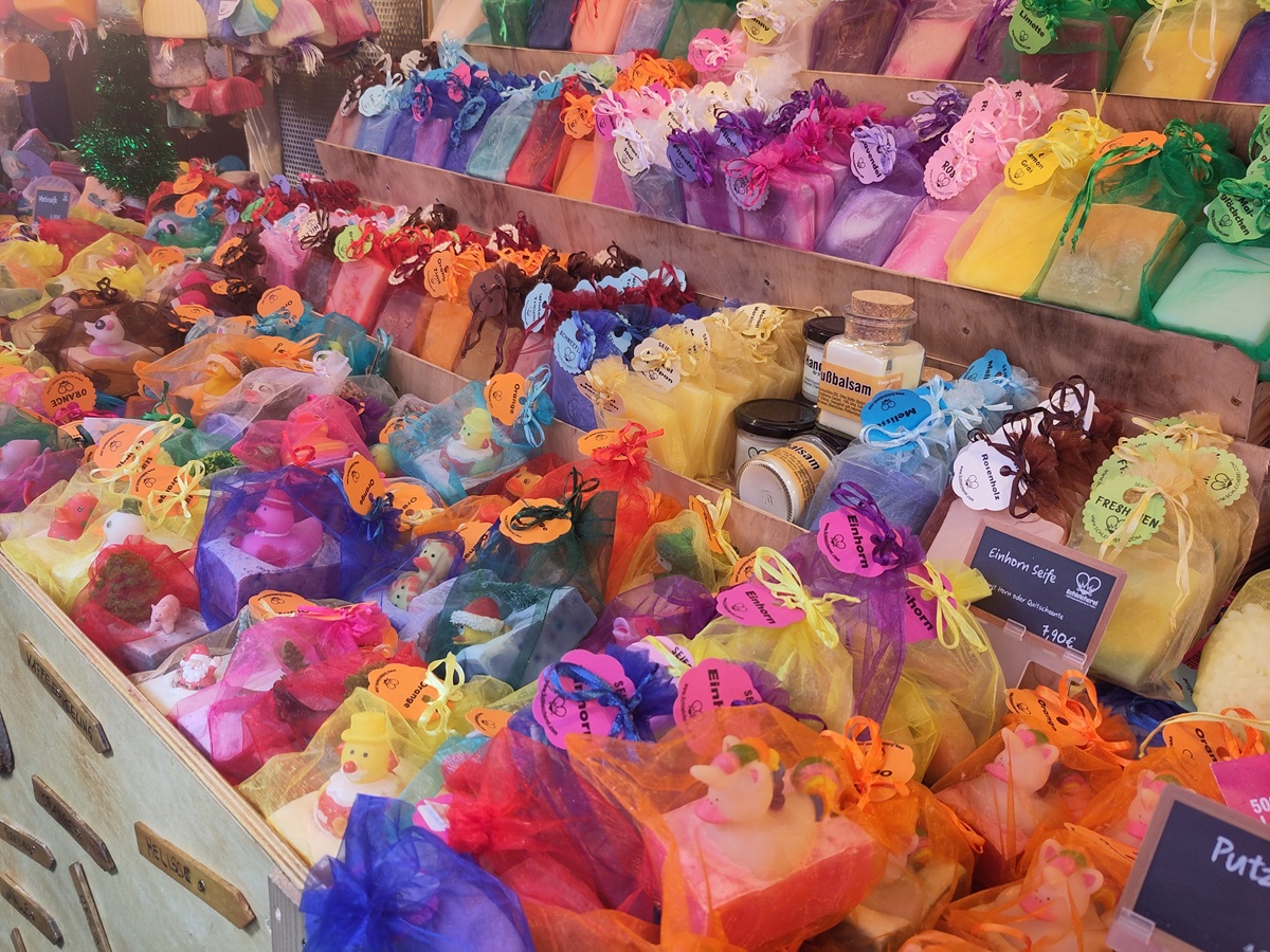 ingt einen Besuch wert sind die Stände der Schleicherei (Stand Nr. 130 auf dem Hauptmarkt und Stand Nr. 6 auf der Kinderweihnacht), dort findest du handgesiedete, fantasievolle Naturseifen, Dusch-, Haar-, Gesichts- sowie Rasierseifen, Badesalz, Badesprudelkugeln, Massage- und Körperbutter mit tollen Düften in fröhlichen Farben.