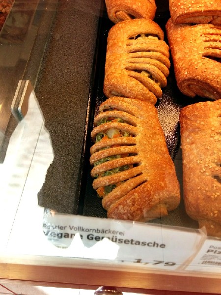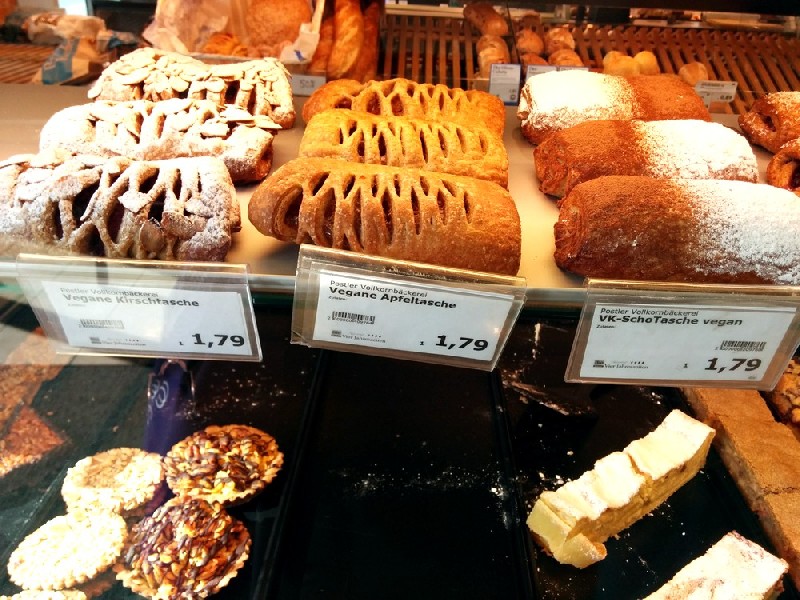 An der Theke direkt am Eingang findest du eine große Auswahl an veganen Backwaren, Gebäck und Snacks, darunter Brote, Brötchen, Baguettes, Burger, Apfel-, Pfirsich- und Schokotaschen, und Pizzaschnecken. Außerdem gibt es täglich ein hervorragendes Mittagsmenü, das immer mindestens eine, meist zwei vegane Optionen bereit hält.