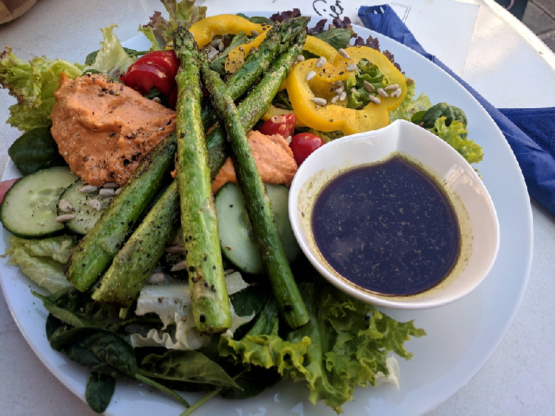 Außerdem auf der Karte stehen Riesen-Sandwiches und Wraps, in der veganen Variante jeweils unter anderem mit Avocado, gebratenen Pilzen und Zucchini gefüllt. Frisch und knackig wird es mit dem großen gemischten Salat mit Salatblättern, Babyspinat, Kirschtomaten, Paprika, Gurke, Sonnenblumenkernen, Balsamico-Dressing und Dinkelbrot, vegan wahlweise mit Kichererbsen oder mit Pilzen und Zucchini.