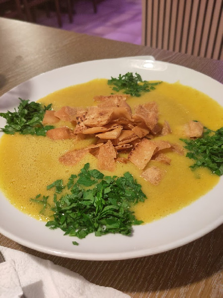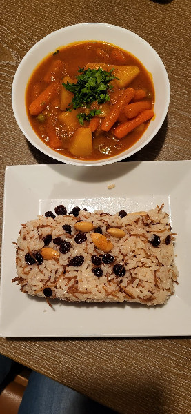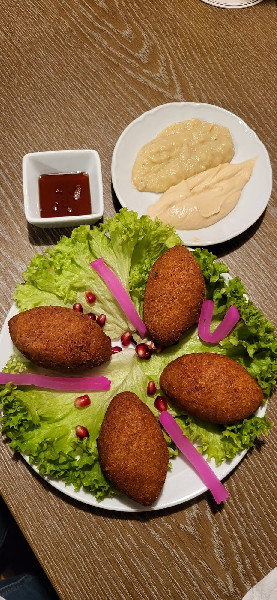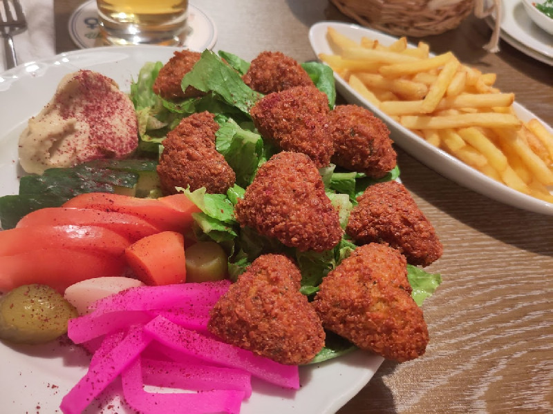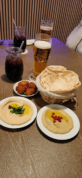 Schon der Gruß aus der Küche ist vegan: herzförmige Falafel mit Fladenbrot, Hummus und Mutabbal (Auberginencreme), garniert mit Granatapfelkernen. Fast alle vegetarischen Speisen auf der Karte sind vegan. Sehr schmackhaft ist Shariye - Reis mit Saloona, Reis mit Reisnudeln und Karotten, Kartoffeln und Erbsen, gekocht in einer Zimt-Kurkuma Soße, ebenso wie Kibbeh in der pflanzlichen Variante mit Walnüssen, Mandeln und Zwiebeln, umhüllt in einem Bulgurteigmantel, serviert mit Salat, Hummus und Mutabbal.