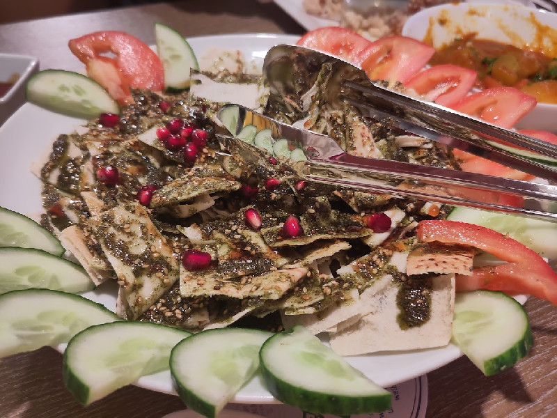 Weil der Fatayir-Teig (eine Art syrische Pizza) nicht vegan ist, ließ sich der Inhaber und Koch für uns etwas Besonderes einfallen und kreierte einen Salat aus Fladenbrot, sodass auch wir das Za'atar, eine Würzmischung mit syrischem Thymian, kosten konnten.