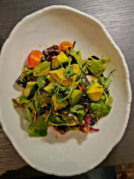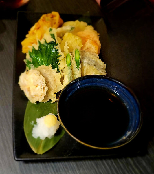 Genieße kleine Speisen wie sautierte Aubergine mit Dashi-Sauce, Wildkräutersalat mit Avocado, roter Beete, Tomaten und Wafu-Dressing oder Tempura Goshu – frittiertes Gemüse in Tempurateig.