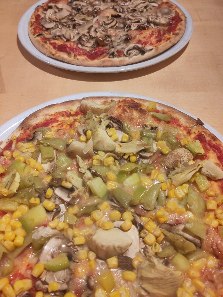 So lassen sich beispielsweise die Pizza Funghi mit Champignons oder die Pizza Vegetaria mit Mais, Paprika, Champignons, Artischocken und Peperoni veganisieren. Auch Sonderwünsche gehen klar. Das herzliche Team hat uns sogar schon mal einen ganz besonderen Pizzawunsch erfüllt: vegane Pizza mit reichlich Nudeln drauf und viel Gemüse und veganem Käse. War fantastisch!